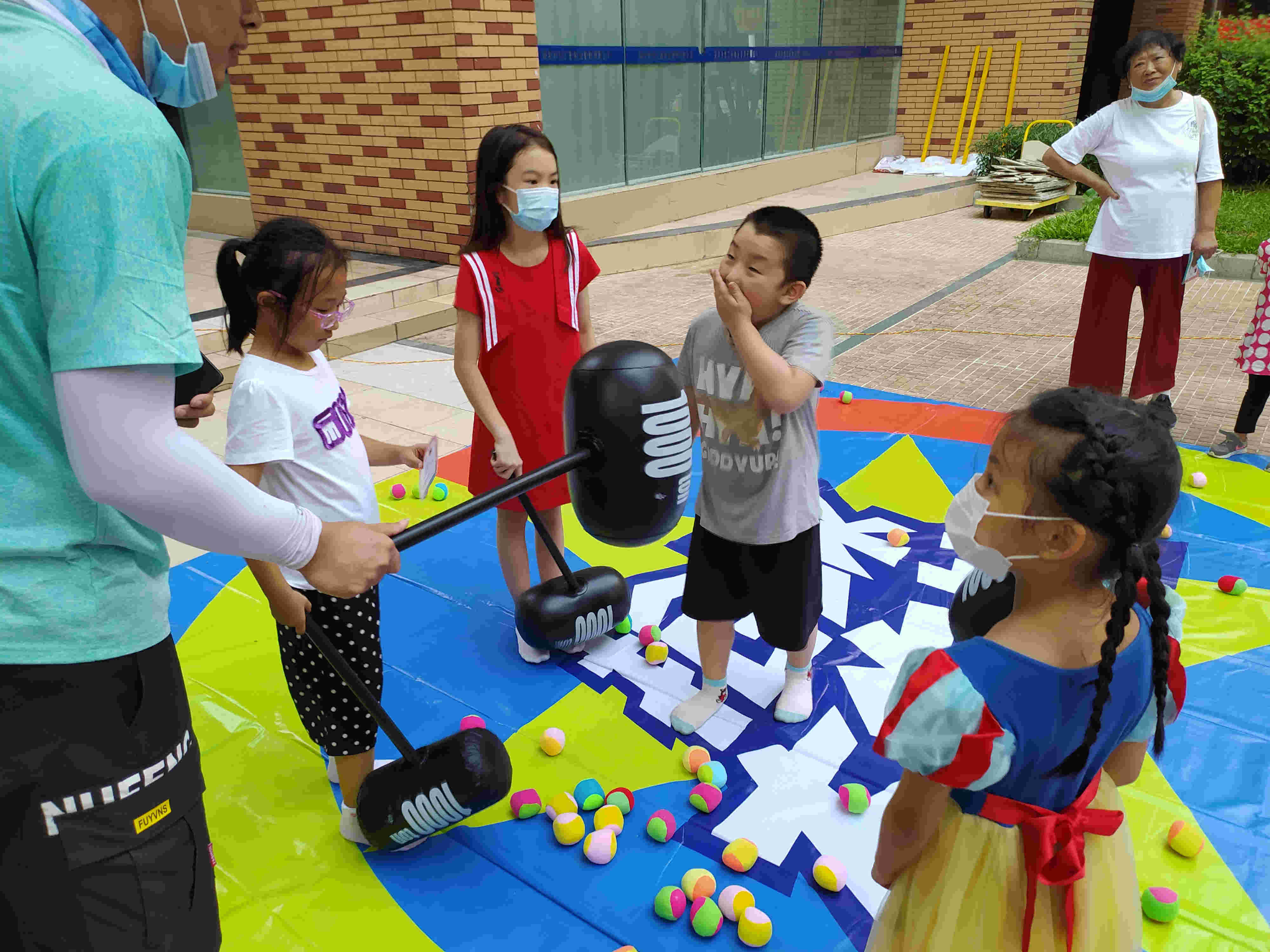 小朋友拿著充氣錘子道具,守護(hù)在圈內(nèi)的小彩球,家長(zhǎng)們?cè)谌ν?,?分鐘內(nèi)小朋友守護(hù)彩球,不被家長(zhǎng)搶奪超過30個(gè)彩球,為通過成功。作用:促進(jìn)家長(zhǎng)和小孩的互動(dòng)和運(yùn)動(dòng)。