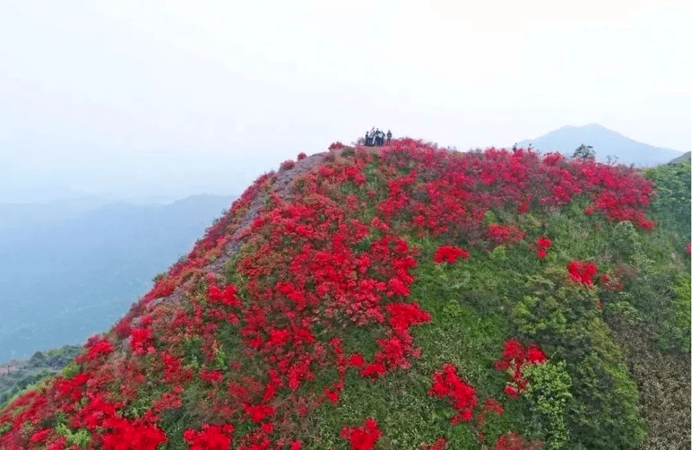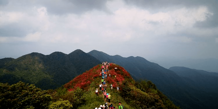 通天蠟燭屬青云山脈,橫跨清遠(yuǎn)市佛岡縣、廣州市從化區(qū)和韶關(guān)市新豐縣,素有“一山踏三市”之稱。三月的春風(fēng)吹綠了大地,佛岡的野生杜鵑也染紅了連片的山脈。杜鵑花又叫映山紅,漫山遍野的紅花籠罩整個(gè)山野,似通紅的蠟燭,故名為“通天蠟燭”。