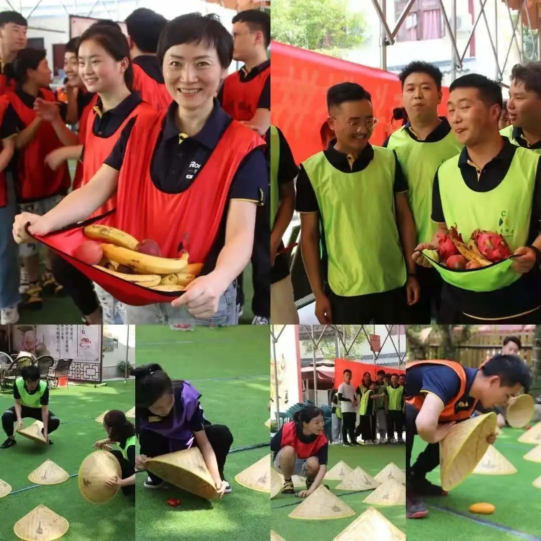 在場地劃定范圍內(nèi)放置外形相同的草帽,每個帽子下面都有一種水果。每個小隊輪流派人進(jìn)入放置草帽的場地競猜。每次只能依次打開兩個草帽;如果兩個草帽下的水果相同,那么便可以將水果帶走,如果水果不同類,須將草帽改好然后返回。沒隊獲得的水果作為物資獎勵發(fā)給隊員享用; 游戲過程中,當(dāng)同伴出現(xiàn)失誤時,要有寬容之心;也增強(qiáng)了團(tuán)隊之間的溝通。
