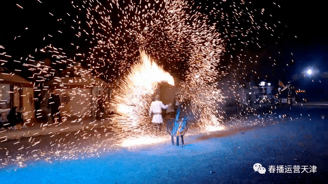 宴席過(guò)后,篝火晚會(huì)正式開(kāi)始,大家載歌載舞,圍著熊熊燃燒的篝火盡情歡暢,當(dāng)?shù)氐哪撩褚矠榭腿藥?lái)了馬頭琴獨(dú)奏和打樹(shù)花的表演,讓客人們欣賞到了草原的文化。