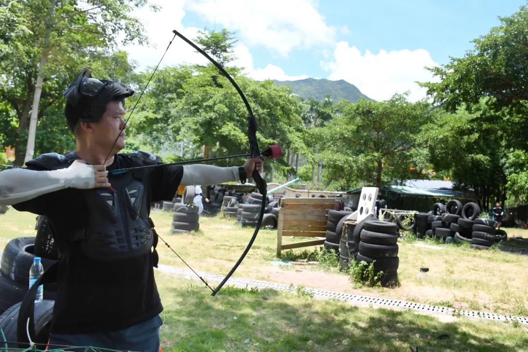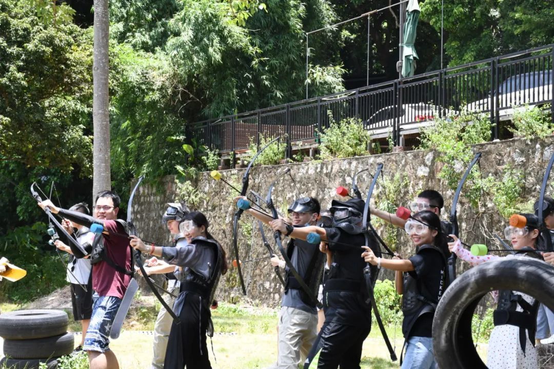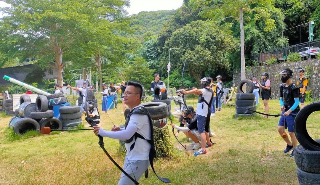 次日清早,眾人驅(qū)車來參加戶外拓展項目——攻防箭,進(jìn)行了一場六十人之間的對抗賽。